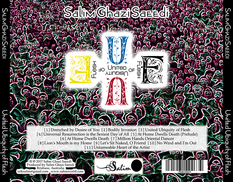 United Ubiquity of Flesh (2017) is an instrumental prog rock album by Salim Ghazi Saeedi, reconciling sonic and conceptual contrasts of his last decade of life: Energetic hard rock guitar and drums balanced by rhythm-free solo guitar parts - similar to traditional Middle Eastern players. In parallel to composing this album, Salim also migrated to Australia, leaving his eastern home town behind except for sonic memories and stories. Salim migrated by the vehicle of his body, as United Ubiquity of Flesh refers to "the flesh" being borders of confinement, the dwelling home and fountain of ideas. The album's booklet reads: "In flesh we are born and in flesh we live. The flesh, thine body is the boundary of desire and belief. The flesh is thine boundary of life and law. The flesh is thine country. The rest are all arbitrary." In United Ubiquity of Flesh, silence - aka musical rest - plays an active part; sometimes by bolding music tones or naked solo guitars on intensively rhythmic bass and drums. In the meantime the album has more references to Salim's Arashk band years compositions and it is less avant-garde in comparison to his recent albums. Until release of previous album in 2012, Salim lived in Iran where he had released 6 albums. Now his 2017 album shows a man's body outlining country borders. Conceptually the composer communicates his challenges around territorial limitations and changes he faced in real life. Salim says: "I was discontent and disturbed of the situation I was raised and breathed in. You could find my life story in the albums I started releasing since 2006 and how I idealized my dream world in 3 albums I released through Arashk band and then claustrophobic Iconophobic (2010), revengeful Human Encounter (2011) and reconciliated namoWoman (2012). Now after migration, I can refer to United Ubiquity of Flesh (2017) as more liberated and progressed." 1. Drenched by Desire of You